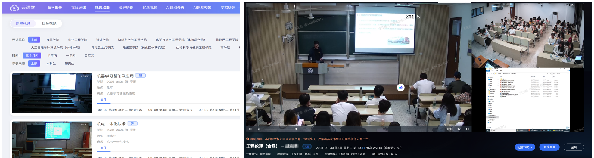 信息化处在2015年开始建设常态化录播系统,多年来不断根据实际情况进行持续迭代升级,将常态化录播系统作为重要的教学支撑,提供给学生课后回看,积极促进教育数字化转型。该系统以录播课程,在线巡课等为核心,构建了一个覆盖课程教学的数字化管理与服务生态。在功能方面,平台提供了次日可点的课程录像以供回看,让学生能够复习所学课程,助力其进行学习回顾与提升。同时,对于老师还提供观看AI课堂分析报告,助力更全面客观的教学研究。在用户体验方面,平台通过直观的可视化报表、灵活的多画面巡课与智能预警推送,为管理者和督导提供高效、便捷的课堂洞察与评估工具,极大提升了管理效率。在系统管理方面,平台具备完善的权限体系,确保了数据的安全性与分析结果的科学性,为校级和院级的精细化治理提供了有力支撑。