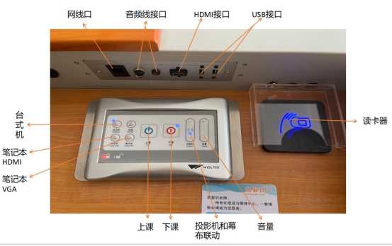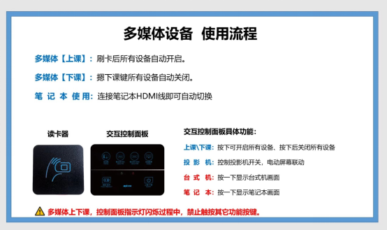 下课时多媒体设备会自动关闭,刷卡开启时取走卡默认为关闭设备。