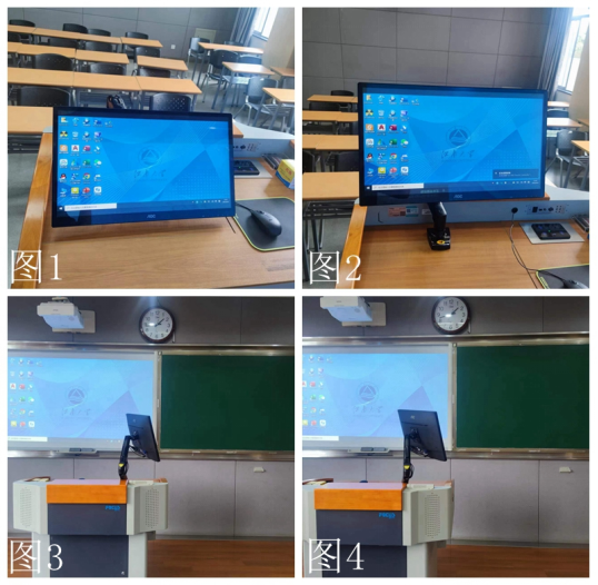 部分配置宽屏投影仪教室配置了相应的宽屏显示器,并在新显示器上安装了可调式支架。通过该可调式支架,可以上下调节,可以左右调节显示器位置,满足老师在讲台上看显示器的不同视角需要,同时也可以缓解老师颈部的疲劳,改善教学体感。见下图示: